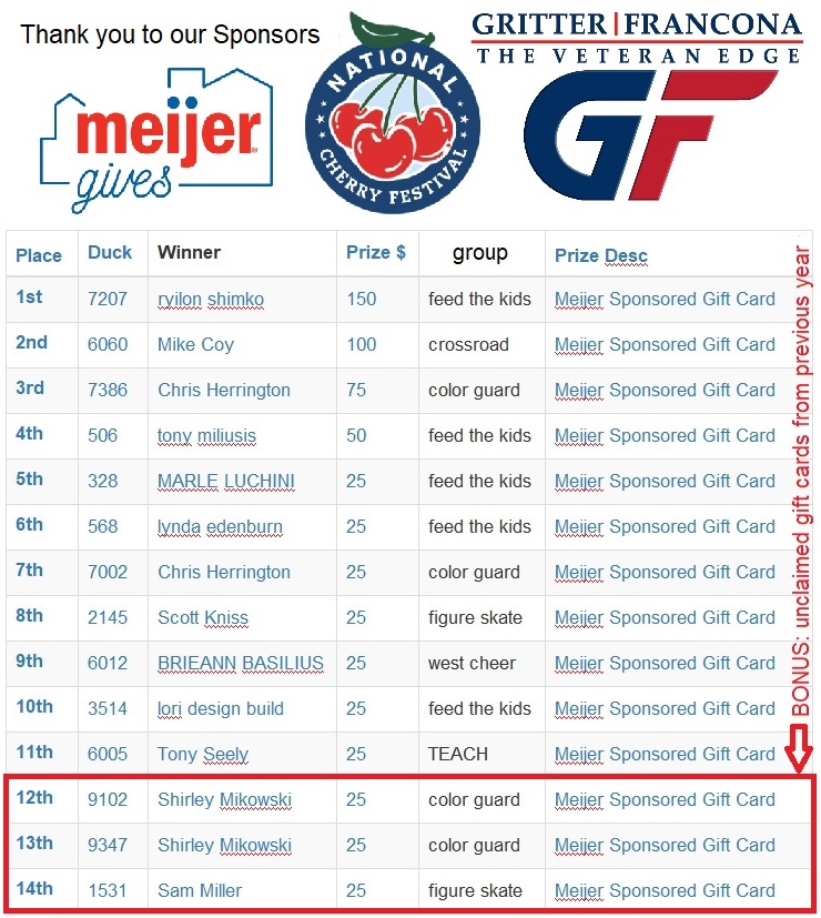 - Yellow Duck Winner Gift Cards Sponsored by Meijer